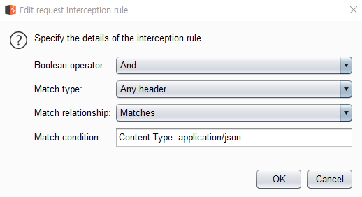 Burpsuite의 intercept 옵션을 이용해 Content-Type: application/json일 경우 intercept할 수 있도록 설정해준다.