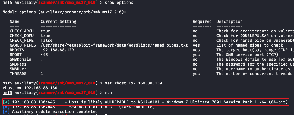 smb_ms17_010 모듈이 실행된 상태에서 희생자 PC의 SMB 취약점 여부를 확인하기 위해 희생자 PC의 IP를 set하고 run 명령어를 입력하여 실행한다. run 명령어 실행하게 되면 희생자 PC(Win7)에 MS17-010 취약점이 있다는 메시지를 확인할 수 있다.