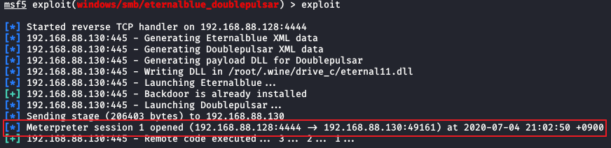 공격에 성공하게 되면 아래와 같은 화면이 나오게 된다. Backdoor is already installed 메시지는 테스트 과정 중 이미 공격이 진행되서 나오는 메시지이다.