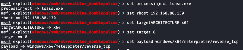 희생자 PC에 취약점이 있는 것을 확인했기 때문에, exploit을 하기위해 eternalblue_doublepulsar 모듈을 실행한다.