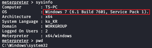 이제 희생자 PC(WIN7)에 세션이 연결됬으니 각종 명령어를 통해 확인해보자.