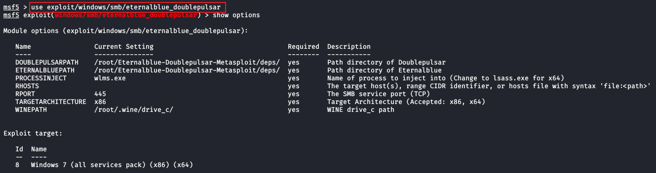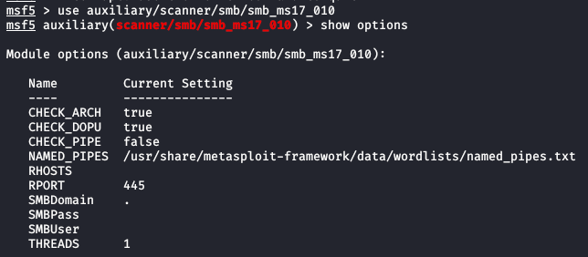 use auxiliary/scanner/smb/smb_ms17_010을 입력하면 모듈 실행이 가능하며 show options 명령어를 입력하면 사용가능한 옵션들을 확인할 수 있다