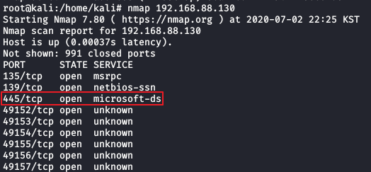 nmap을 이용해 win7의 SMB포트(445/tcp microsoft-ds)가 열려 있는지 확인한다.