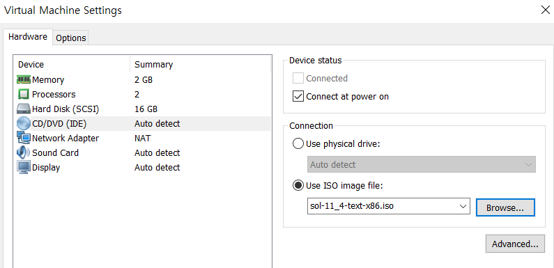다음과 같이 솔라리스 설치를 위한 가상머신 환경 설정 후 가상 머신을 실행한다.