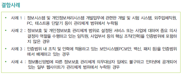 이번 영역에서는 총 16개의 세부 인증기준 중에서 '1.1. 관리체계 기반 마련' 분야에서 '1.1.4 범위 설정' 항목을 확인해보자.