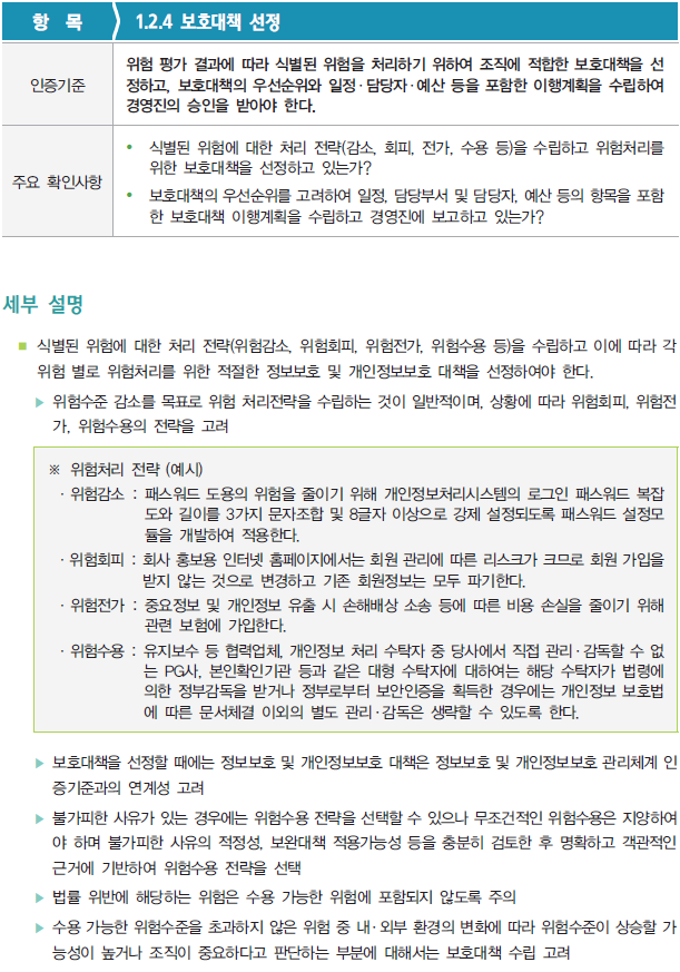 이번 영역에서는 총 16개의 세부 인증기준 중에서 '1.2. 위험 관리' 분야에서 '1.2.4 보호대책 선정' 항목을 확인해보자.
