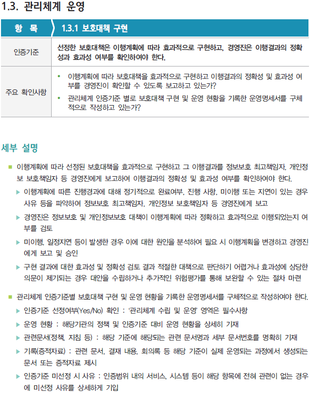 이번 영역에서는 총 16개의 세부 인증기준 중에서 '1.3. 관리체계 운영' 분야에서 '1.3.1 보호대책 구현' 항목을 확인해보자.