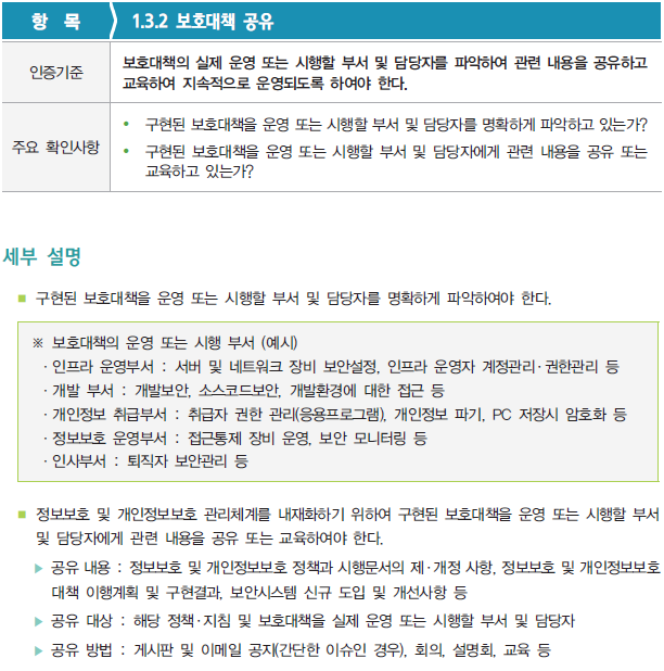 이번 영역에서는 총 16개의 세부 인증기준 중에서 '1.3. 관리체계 운영' 분야에서 '1.3.2 보호대책 공유' 항목을 확인해보자.