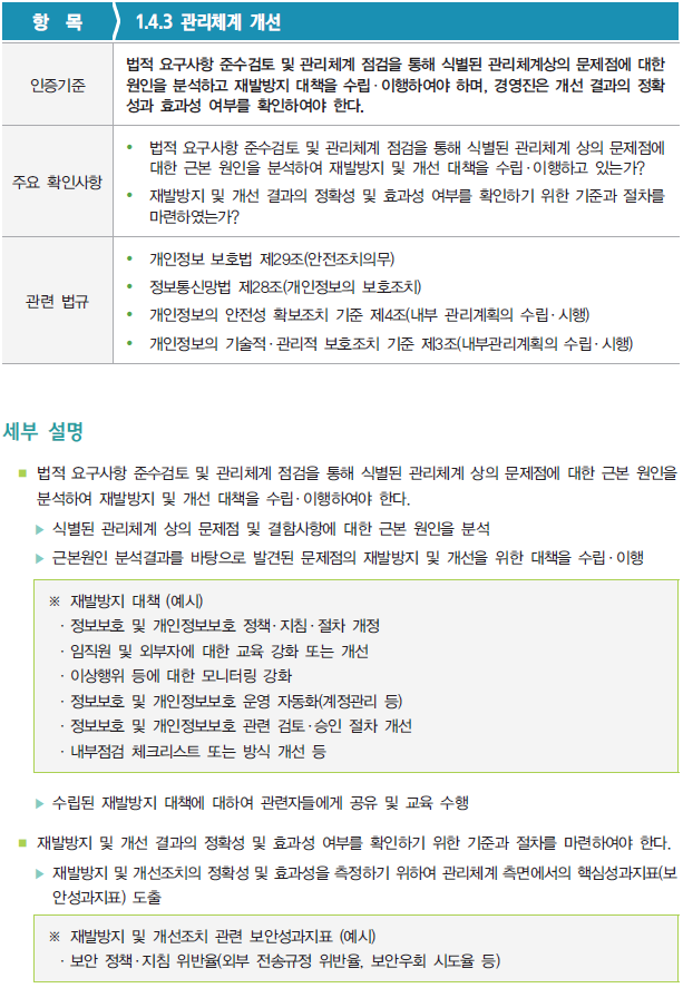 이번 영역에서는 총 16개의 세부 인증기준 중에서 '1.4. 관리체계 점검 및 개선' 분야에서 '1.4.3 관리체계 개선' 항목을 확인해보자.