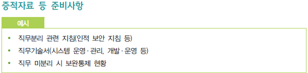 해당 '2.2.2 직무 분리' 항목의 활동을 증빙하기 위한 증적자료 예시는 다음과 같다.