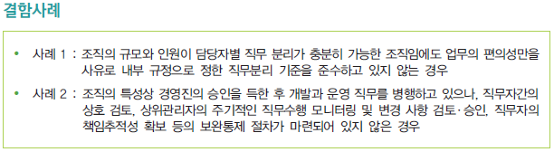 이번 영역에서는 총 64개의 세부 인증기준 중에서 '2.2. 인적 보안' 분야에서 '2.2.2 직무 분리' 항목을 확인해보자.
