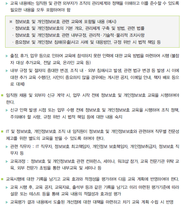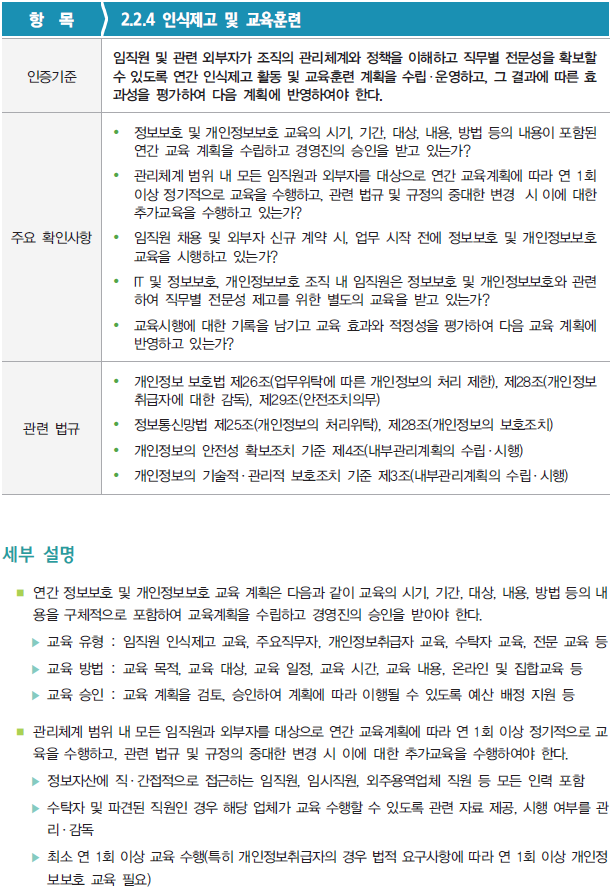 이번 영역에서는 총 64개의 세부 인증기준 중에서 '2.2. 인적 보안' 분야에서 '2.2.4 인식제고 및 교육훈련' 항목을 확인해보자.