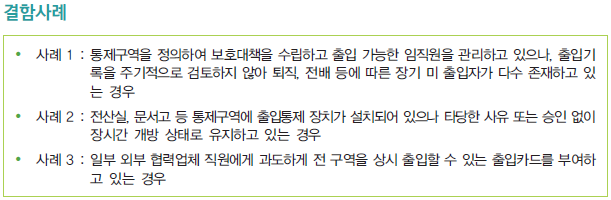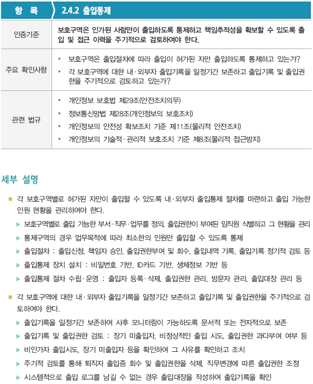이번 영역에서는 총 64개의 세부 인증기준 중에서 '2.4. 물리 보안' 분야에서 '2.4.2 출입통제' 항목을 확인해보자.