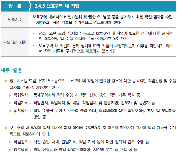 이번 영역에서는 총 64개의 세부 인증기준 중에서 '2.4. 물리 보안' 분야에서 '2.4.5 보호구역 내 작업' 항목을 확인해보자.