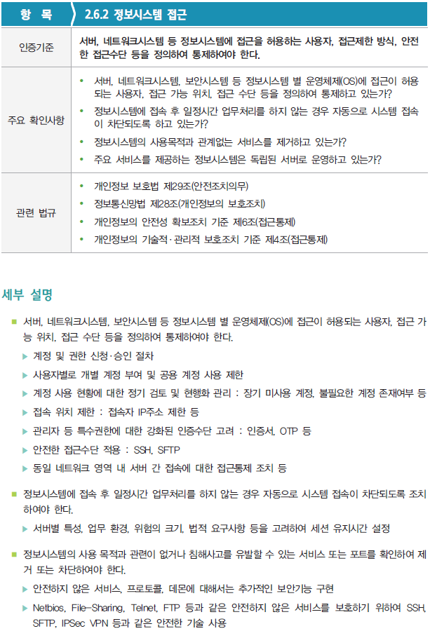 이번 영역에서는 총 64개의 세부 인증기준 중에서 '2.6. 접근통제' 분야에서 '2.6.2 정보시스템 접근' 항목을 확인해보자