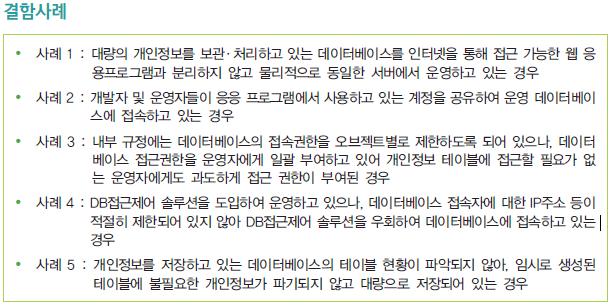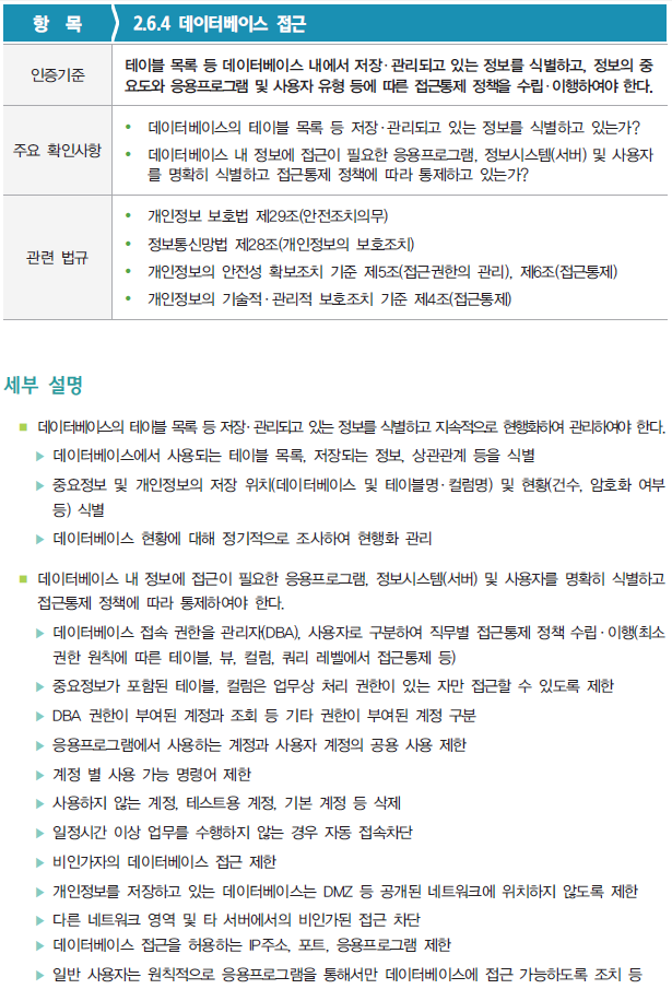 이번 영역에서는 총 64개의 세부 인증기준 중에서 '2.6. 접근통제' 분야에서 '2.6.4 데이터베이스 접근' 항목을 확인해보자