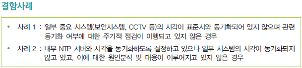 이번 영역에서는 총 64개의 세부 인증기준 중에서 '2.9. 시스템 및 서비스 운영관리' 분야에서 '2.9.6 시간 동기화' 항목을 확인해보자