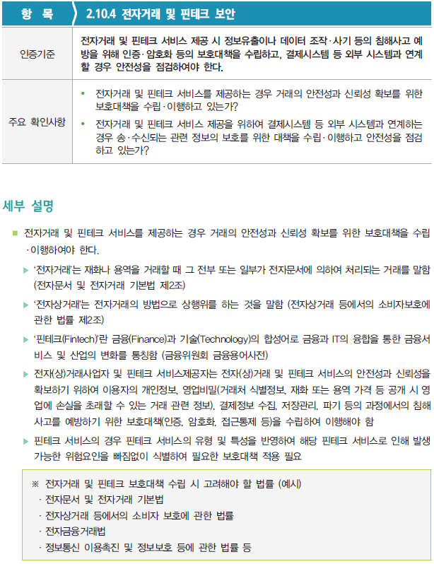이번 영역에서는 총 64개의 세부 인증기준 중에서 '2.10. 시스템 및 서비스 보안관리' 분야에서 '2.10.4 전자거래 및 핀테크 보안' 항목을 확인해보자