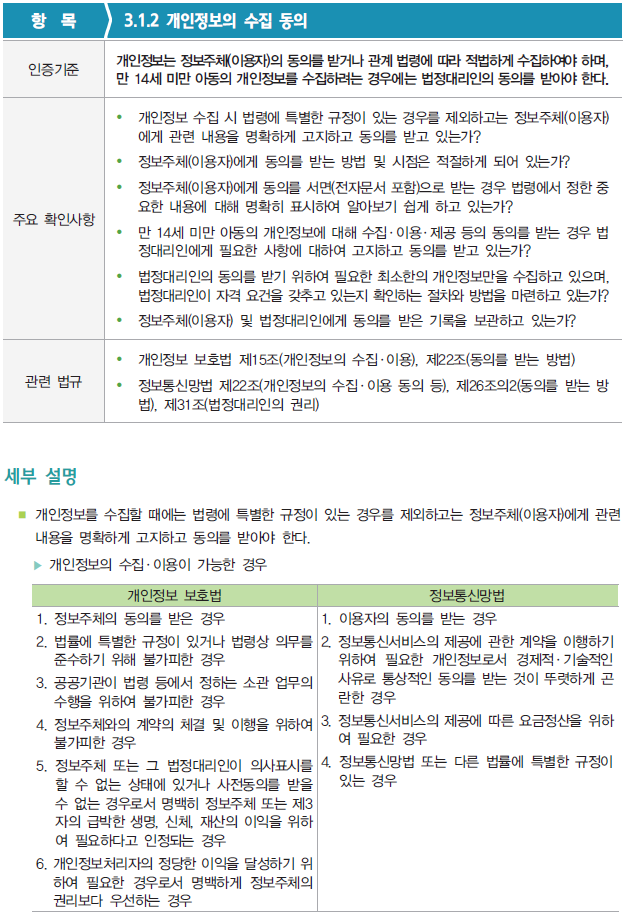 이번 영역에서는 총 22개의 세부 인증기준 중에서 '3.1. 개인정보 수집 시 보호조치' 분야에서 '3.1.2 개인정보의 수집 동의' 항목을 확인해보자