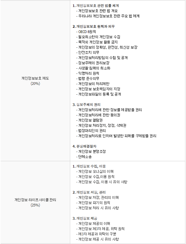 CPPG의 출제기준은 '1. 개인정보보호의 이해(10%)', '2. 개인정보보호 제도(20%)', '3. 개인정보 라이프사이클 관리(25%)', '4. 개인정보의 보호조치(30%)', '5. 개인정보 관리체계(15%)' 총 5가지 기준으로 구성되어 있다.