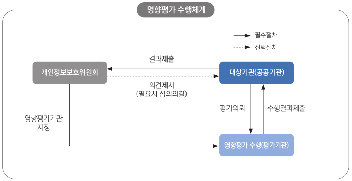 일정규모 이상의 개인정보를 전자적으로 처리하는 개인정보파일을 구축 · 운영 또는 변경하려는 공공기관은 개인정보보호법 제33조(개인정보 영향평가) 및 동법 시행령 제35조(개인정보 영향평가의 대상)에 근거하여 영향평가를 수행해야 합니다.