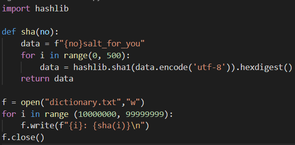데이터 사전은 100000000salt_for_you부터 시작하여 99999999salt_for_you까지의 문자열을 모두 500회 sha1 HASH 하여 그 데이터를 저장한다.