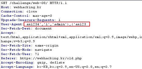 그 후 페이지 새로고침 후 똑같이 Burp Suite를 이용하여 User-Agent 부분에 insert했던 as1234 값을 넣어 전달하게 되면 문제가 풀리는 것을 확인할 수 있다.