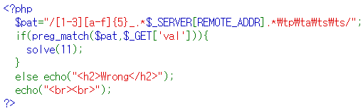 .*\tp\ta\ts\ts : \t는 탭을 의미함으로 (탭)p(탭)a(탭)s(탭)s를 찾는 정규식표현, 하지만 문제에서는 GET방식으로 val변수에 값을 넣어 전달하므로 tab을 url 인코딩해야 한다. \t를 인코딩하게되면 %09 값이 나오게 된다.