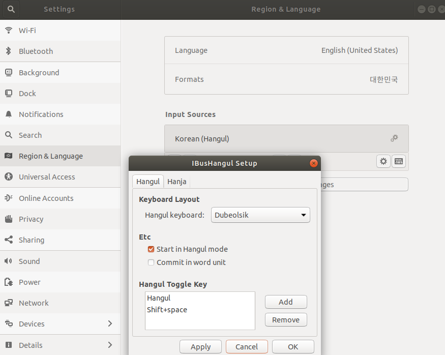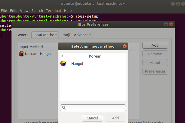 - ibus-setup -> Input Method -> Add -> Korean(Hangul) 추가