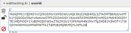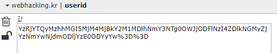 이제 문제를 풀기 위해서는 admin 문자열을 md5 인코딩 -> base64 인코딩 -> url인코딩 순서대로 처리하여 userid 쿠키값에 대입하면 된다.