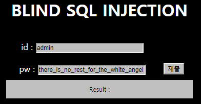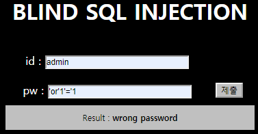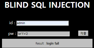우리는 admin 계정으로 로그인 하기 위해 Blind SQL Injection을 통해 참 / 거짓일 때의 반응을 살펴보자.
