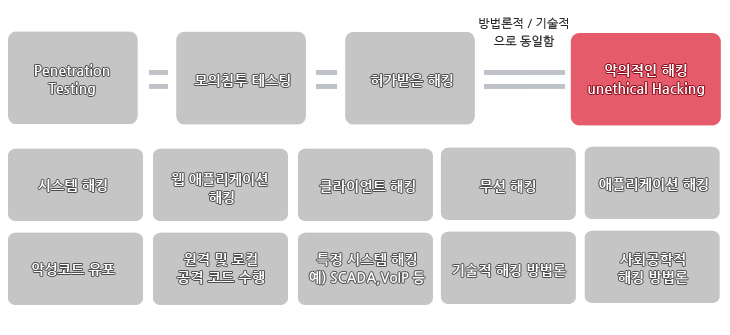 - 기업 및 기관 내·외부 주요 정보를 보호하기 위한 주기적이고, 지속적이며, 항시적인 모의침투테스팅 및 위험분석이 필요합니다. 이는 위와 같은 위협과 위험이 매우 빠른 속도로 변화하고 다각화 되는 공격 기법에 대응하기 위한 필수 조건입니다.