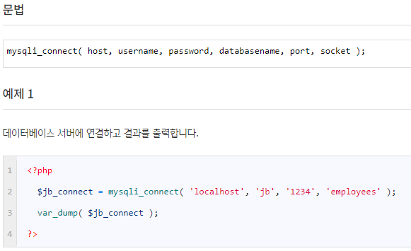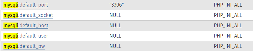 mysqli_connect는 MySQL, MariaDB에 연결하는 함수이다. 해당 함수를 사용하기 위해서는 값들이 필요한데 해당 소스코드에는 어떤 값들도 들어있지 않다. 이런 경우에는 default값을 가져와서 사용하게 되는데 기본 값을 아래의 php 매뉴얼 사이트에서 확인할 수 잇다.
