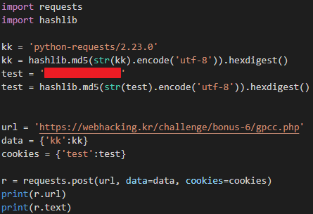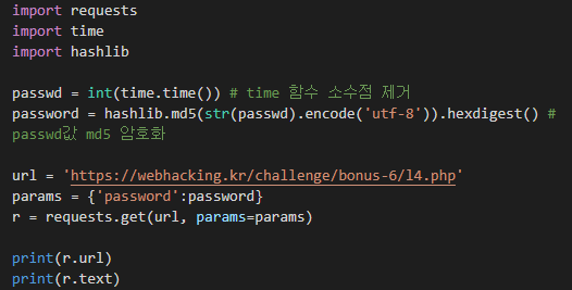 네번째에는 힌트와 함께 현재 시간을 md5형식으로 변환하여 password 변수에 담아 전송하면 된다.
