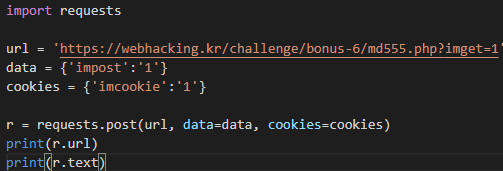 url을 통해 imget을 보내고 post방식으로 데이터 impost를 보내고 cookie값으로 imcookie를 보내면 다음 페이지로 넘어갈 수 있다.