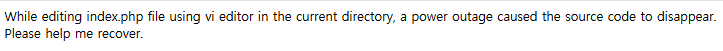 현재 디렉터리에서 vi 에디터를 이용하여 index.php파일을 편집하던 도중, 정전으로 인해 소스코드가 유실됬음으로 복구를 요청하는 메시지이다.