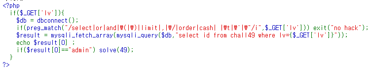 lv변수에 select, or, and, (, ), limit, ',', /, order, cash, 공백, \t(tab), ', " 문자열은 필터링 된다.