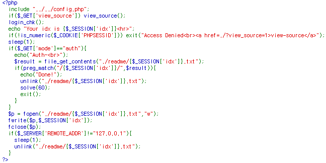 $_GET['mode']의 값이 auth 이면 file_get_contents()함수를 이용해 ./readme/{$_SESSION['idx']}.txt 파일을 문자열로 읽어들인다.