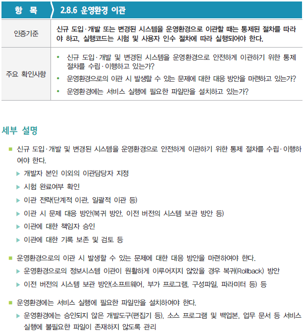 [ISMS/ISMS-P] 2.8.6 운영환경 이관 관리체계 인증기준 2번째 영역인 '2. 보호대책 요구사항' 부터 살펴보자. 이번 영역에서는 총 64개의 세부 인증기준 중에서 '2.8. 정보시스템 도입 및 개발 보안' 분야에서 '2.8.6 운영환경 이관' 항목을 확인해보자 해당 '2.8.6 운영환경 이관' 항목의 활동을 증빙하기 위한 증적자료 예시는 다음과 같다. 다음은 결함사례를 살펴보자. 정보보호 인증/ISMS-P 2021.11.18