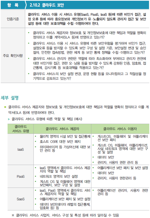 [ISMS/ISMS-P] 2.10.2 클라우드 보안 관리체계 인증기준 2번째 영역인 '2. 보호대책 요구사항' 부터 살펴보자. 이번 영역에서는 총 64개의 세부 인증기준 중에서 '2.10. 시스템 및 서비스 보안관리' 분야에서 '2.10.2 클라우드 보안' 항목을 확인해보자 해당 '2.10.2 클라우드 보안' 항목의 활동을 증빙하기 위한 증적자료 예시는 다음과 같다. 다음은 결함사례를 살펴보자. 정보보호 인증/ISMS-P 2021.11.18
