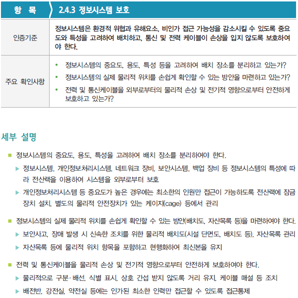 [ISMS/ISMS-P] 2.4.3 정보시스템 보호 관리체계 인증기준 2번째 영역인 '2. 보호대책 요구사항' 부터 살펴보자. 이번 영역에서는 총 64개의 세부 인증기준 중에서 '2.4. 물리 보안' 분야에서 '2.4.3 정보시스템 보호' 항목을 확인해보자. 해당 '2.4.3 정보시스템 보호' 항목의 활동을 증빙하기 위한 증적자료 예시는 다음과 같다. 다음은 결함사례를 살펴보자. 정보보호 인증/ISMS-P 2021.11.16