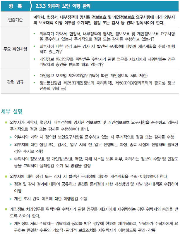 [ISMS/ISMS-P] 2.3.3 외부자 보안 이행 관리 관리체계 인증기준 2번째 영역인 '2. 보호대책 요구사항' 부터 살펴보자. 이번 영역에서는 총 64개의 세부 인증기준 중에서 '2.3. 외부자 보안' 분야에서 '2.3.3 외부자 보안 이행 관리' 항목을 확인해보자. 해당 '2.3.3 외부자 보안 이행 관리' 항목의 활동을 증빙하기 위한 증적자료 예시는 다음과 같다. 다음은 결함사례를 살펴보자. 정보보호 인증/ISMS-P 2021.11.16
