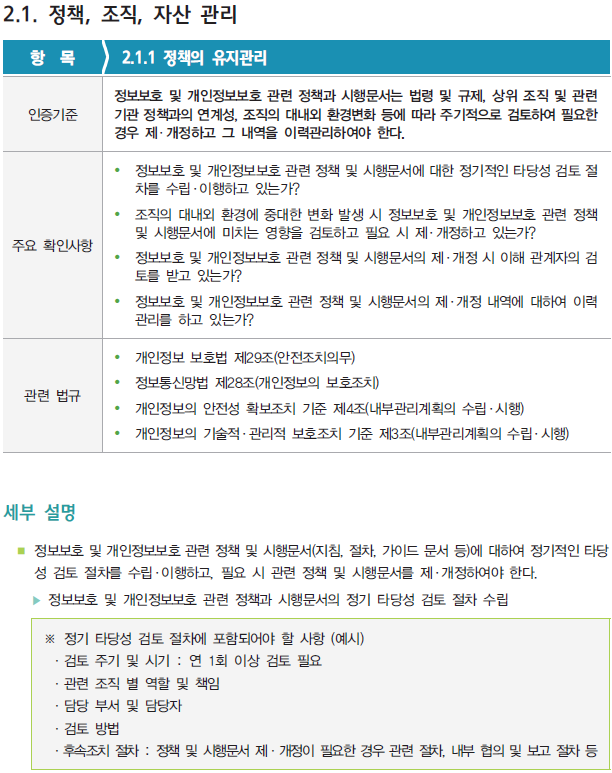 [ISMS/ISMS-P] 2.1.1 정책의 유지관리 관리체계 인증기준 2번째 영역인 '2. 보호대책 요구사항' 부터 살펴보자. 이번 영역에서는 총 64개의 세부 인증기준 중에서 '2.1. 정책, 조직, 자산 관리' 분야에서 '2.1.1 정책의 유지관리' 항목을 확인해보자. 해당 '2.1.1 정책의 유지관리' 항목의 활동을 증빙하기 위한 증적자료 예시는 다음과 같다. 다음은 결함사례를 살펴보자. 정보보호 인증/ISMS-P 2021.11.15