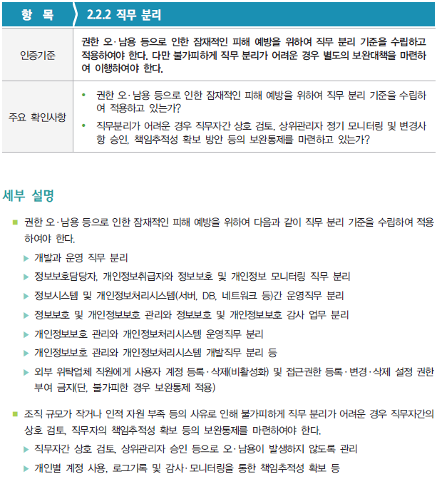 [ISMS/ISMS-P] 2.2.2 직무 분리 관리체계 인증기준 2번째 영역인 '2. 보호대책 요구사항' 부터 살펴보자. 이번 영역에서는 총 64개의 세부 인증기준 중에서 '2.2. 인적 보안' 분야에서 '2.2.2 직무 분리' 항목을 확인해보자. 해당 '2.2.2 직무 분리' 항목의 활동을 증빙하기 위한 증적자료 예시는 다음과 같다. 다음은 결함사례를 살펴보자. 정보보호 인증/ISMS-P 2021.11.15
