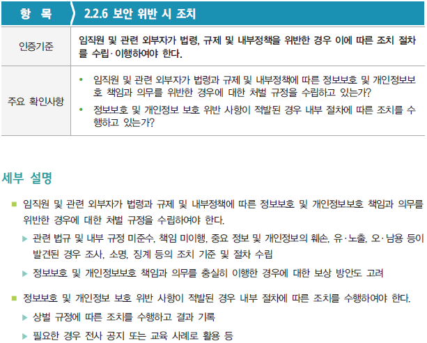 [ISMS/ISMS-P] 2.2.6 보안 위반 시 조치 관리체계 인증기준 2번째 영역인 '2. 보호대책 요구사항' 부터 살펴보자. 이번 영역에서는 총 64개의 세부 인증기준 중에서 '2.2. 인적 보안' 분야에서 '2.2.6 보안 위반 시 조치' 항목을 확인해보자. 해당 '2.2.6 보안 위반 시 조치' 항목의 활동을 증빙하기 위한 증적자료 예시는 다음과 같다. 다음은 결함사례를 살펴보자. 정보보호 인증/ISMS-P 2021.11.16