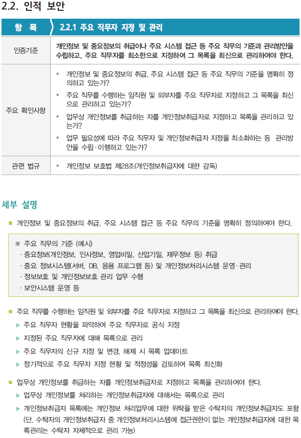 [ISMS/ISMS-P] 2.2.1 주요 직무자 지정 및 관리 관리체계 인증기준 2번째 영역인 '2. 보호대책 요구사항' 부터 살펴보자. 이번 영역에서는 총 64개의 세부 인증기준 중에서 '2.2. 인적 보안' 분야에서 '2.2.1 주요 직무자 지정 및 관리' 항목을 확인해보자. 해당 '2.2.1 주요 직무자 지정 및 관리' 항목의 활동을 증빙하기 위한 증적자료 예시는 다음과 같다. 다음은 결함사례를 살펴보자. 정보보호 인증/ISMS-P 2021.11.15
