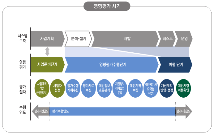 개인정보 영향평가는 개인정보를 활용하는 새로운 정보시스템의 도입 및 기존 정보시스템의 중요한 변경 시, 시스템의 구축 · 운영이 기업의 고객은 물론 국민의 프라이버시에 미칠 영향에 대하여 미리 조사 · 분석 · 평가하는 체계적인 절차입니다. ISMS(정보보호 관리체계 인증)도 인증 의무대상이 있는 것처럼, 개인정보 영향평가도 의무 평가 대상이 있습니다. 그게 누구일까요? 일정규모 이상의 개인정보를 전자적으로 처리하는 개인정보파일을 구축 · 운영 또는 변경하려는 공공기관은 개인정보보호법 제33조(개인정보 영향평가) 및 동법 시행령 제35조(개인정보 영향평가의 대상)에 근거하여 영향평가를 수행해야 합니다.- (5만명 조건) 5만명 이상의 정보주체의 민감정보 또는 고유식별정보의 처리가 수반되는 개인정보파일- ..